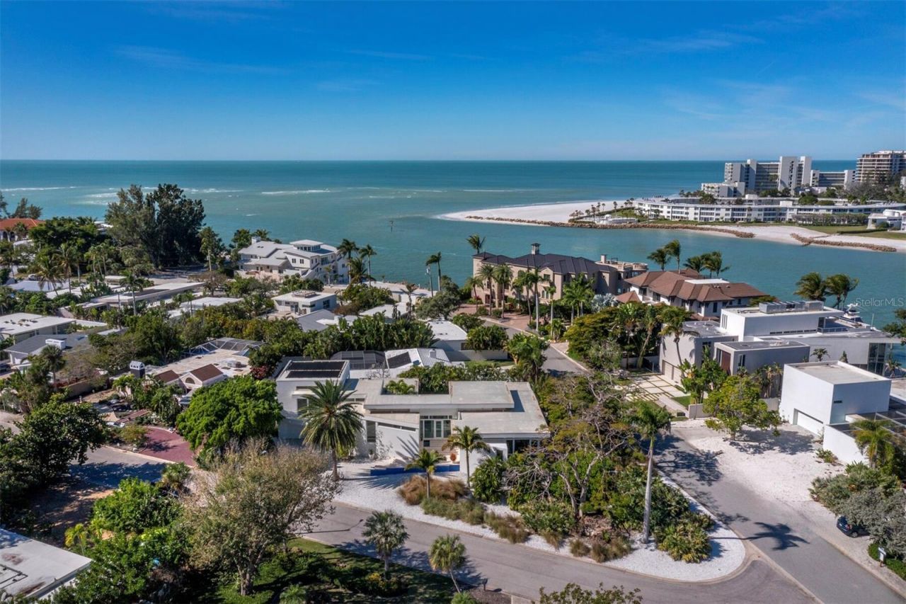 An icon of modern design in the style of the world-renowned Sarasota School of Architecture, 1235 Center Place combines award-winning pedigree with exceptional luxury in a setting that is as coveted for its natural beauty and access to amenities as for its storied mid-century and modern estates. Known as the Light Box House for its distinctive angles and use of glass walls to showcase courtyard and exterior views, this home was custom built in 2012 by the current owners to foster both idyllic privacy and elevated hospitality. The home and architect Jonathan Parks have been widely celebrated for its design, winning the AIA Tampa Bay Merit Award for Architecture and the Grand Aurora Award for a custom home, with features in the Herald-Tribune's Style Magazine, Sarasota Observer, and HomeDSGN magazine. Occupying the corner lot of Westway and Center and two doors away from the famed Umbrella House, the home is thoughtfully oriented around a central pool that serves as a focal point for both reflection and recreation. Stretching between north and south wings that gently delineate spaces for private retreat and open entertaining, 3,700 A/C square feet encompass three bedrooms with three and a half bathrooms, an office, an open concept gourmet kitchen and adjacent dining and living space, all purposefully positioned to capture optimal light and accentuate the interplay of built features with the tropical landscape. An elegant contrast to the brilliant sky and foliage outside, the interior is a refined gallery that meticulously balances walls of glass with solid surfaces for display and function, from art-hung walls to Caesarstone countertops. While complementing the mid-century style of surrounding homes, contemporary construction here offers the significant advantages of elevation for flood consideration, high-efficiency impact rated materials, and modern integrations including heated primary bathroom floor, motorized window coverings, Generac generator, LED landscape lighting, and more. Recent upgrades include two Carrier Infinity HVAC systems installed in 2025 and 2024. Lido Shores is coveted for its concentration of mid-century, modern, and post-modern homes, with masterpieces by Paul Rudolph, Carl Abbott, Don Chapell, and others renowned for their architectural influence. Enhancing its island luxury, this residence enjoys the ultimate and rare privilege of deeded access to a private white sand beach and covered pavilion exclusive to Lido Shores property owners. Serene and private but within minutes of St. Armands Circle and Downtown, this special island enclave offers immediate access to the tropical waters of Sarasota Bay and the Gulf and innumerable cultural amenities that include fine and performing arts, dining, and shopping.