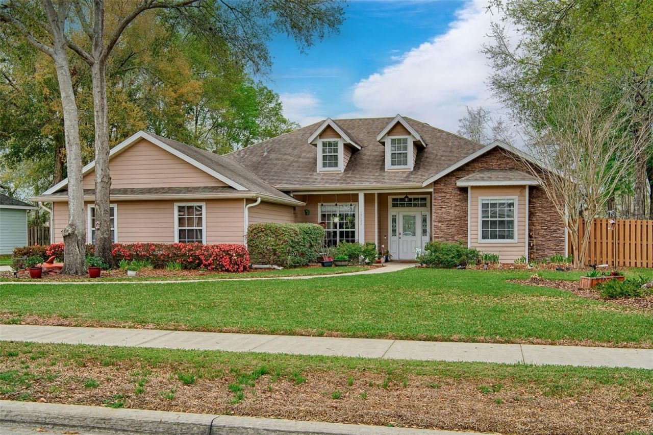 Located in the gated community of Wyndswept Hills, this 2,094 sq ft home features 4 bedrooms and 3 full baths on .33-acres. The exterior has cement Hardi siding with stone accents, a front porch with rain gutters, a side-entry 2-car garage. Step inside to a foyer that opens to a spacious living room with built-ins and a custom tray ceiling, overlooking the screened-in patio and private backyard. To the left of the entry is a dining room with engineered hardwood floors and a tray ceiling. The kitchen offers plenty of cabinet space, quartz countertops, stainless steel appliances and a breakfast bar with pendant lighting, overlooking a breakfast room with backyard views. The large primary suite features a custom tray ceiling and an additional sitting room, perfect for a fitness area, extra lounge space or office, with direct access to the screened-in patio. The primary en suite includes double vanities, a glass-door shower, a soaking tub and two walk-in closets. Three additional bedrooms are located on the opposite side of the home. Two bedrooms share a second full bath, while the third is an en suite with its own private bath with walk in shower. Laundry room with storage shelves and a utility sink leads directly to the 2-car garage. The backyard is private with an oversized stone paver patio that runs the full length of the home, raised garden beds and fruit trees. Additional highlights include 10+ foot ceilings, whole-house water filtration, engineered hardwood and vinyl plank throughout. Low HOA, $42 a month, lot with an irrigation system and a large privacy-fenced backyard. Conveniently located close to downtown Alachua, Easy access to I-75, 441 and Gainesville. UF, Shands, North Florida Hospital and VA Hospital an easy drive. Enjoy local shopping and dining.
